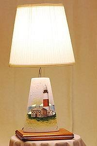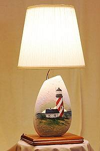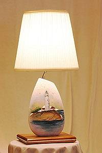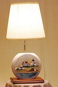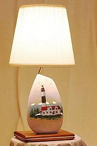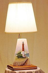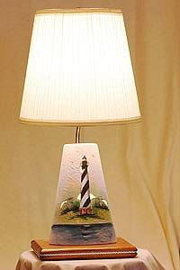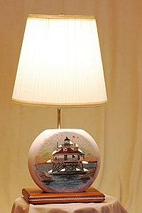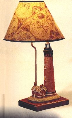 (Click on boxes above to view Lefton Lighthouse Table Lamps only) Each lighthouse, lantern or artist lamp is permanently mounted on thick, solid, five-quarter pine planking, grooved to simulate a pier or deck, and wrapped in their trademark white nautical rope. Each base is stained in a rich and warm tone for looks, then top-coated for permanence and protection. The lamp is completed with a heavy antique tan parchment shade and a solid brass finial. These lamps are SPECIAL ORDER items and, as such, will be charged to your account as soon as your order is placed with the manufacturer. They are not cancellable nor returnable once the order has been placed and are sold on a FINAL SALE basis only!! A Beautiful Addition to Home Or Office Decor-That Different Gift You Were Looking For!!